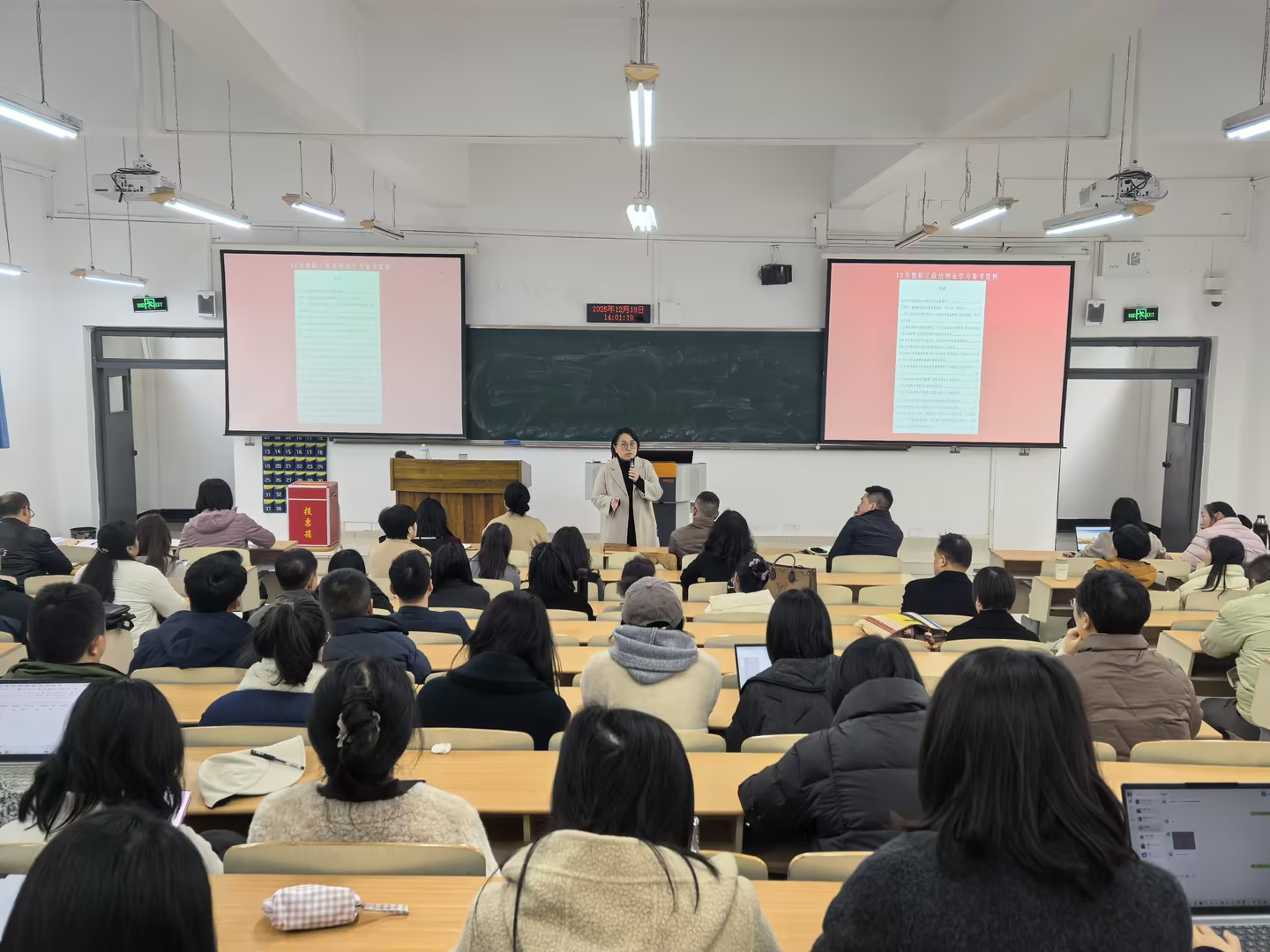 为深入学习贯彻党的二十届四中全会精神,推动政治理论学习走深走实,我院于12月18日召开全体教职工政治理论学习大会。会议集中学习了《2025年12月教职工政治理论学习参考资料》,重点围绕习近平总书记关于全面依法治国、党的自我革命、新质生产力发展以及网络生态治理等重要论述展开。