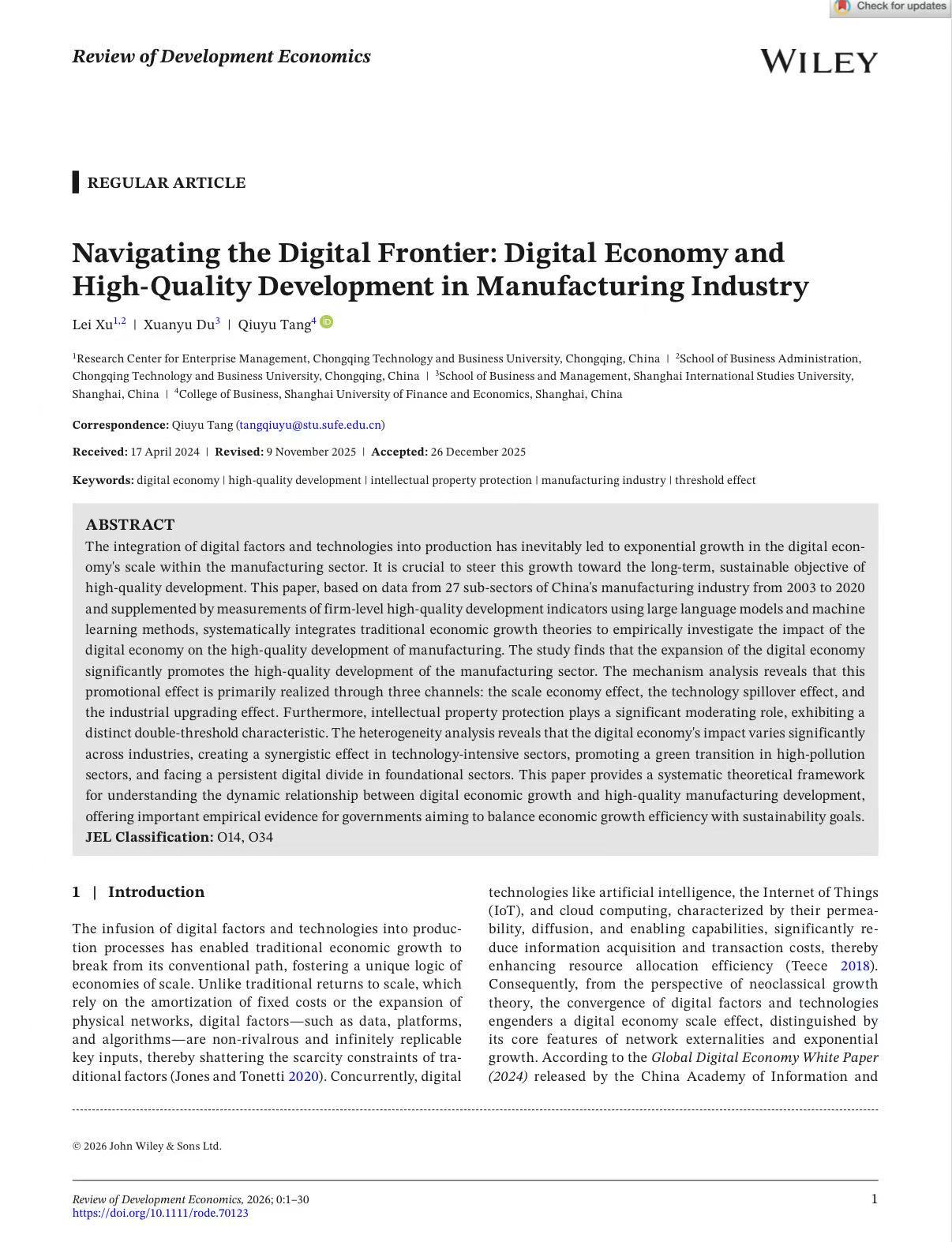 Xu L, Du X, Tang Q*(通讯作者). Navigating the Digital Frontier: Digital Economy and High-Quality Development in Manufacturing Industry (SSCI JCR Q2,中科院SSCI三区期刊), Review of Development Economics, 2026. https://doi.org/10.1111/rode.70123