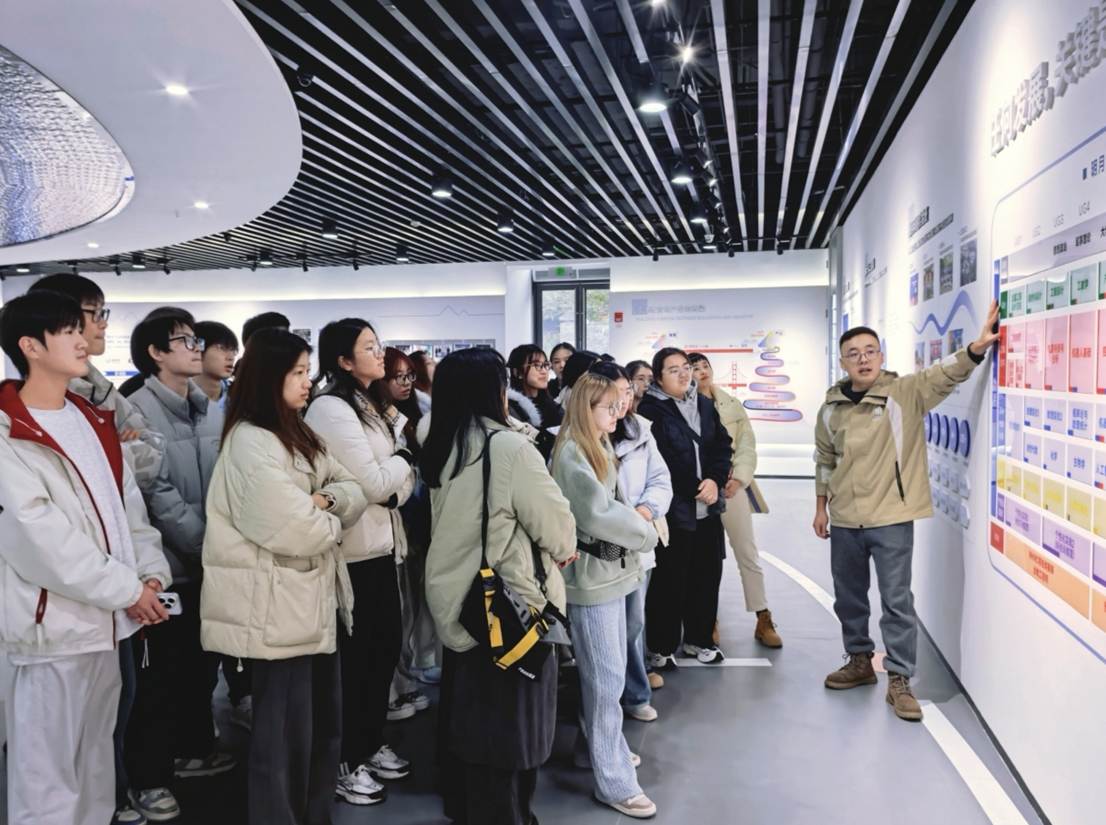 下午两点,同学们在项目负责老师的带领下步入基地展览中心。工商管理学院党委书记、副院长陈亚惠在参观前表示:“我们将课堂‘搬’进科创基地,就是希望同学们在起步阶段就能触摸到学科融合的脉搏,在行走中思考,在体验中学习。”展厅内,从基础科研到产业转化的创新链条清晰呈现,同学们认真聆听讲解,不时交流提问,在实景中理解管理思维与工程技术的结合点。