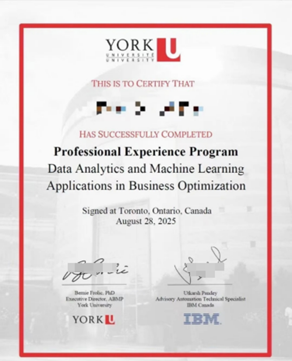 4. 名校名企双重背书:同时获得约克大学与IBM联合颁发项目证书,小组项目报告,为个人升学或求职履历增添耀眼一笔。(优秀学员可获得IBM导师推荐信)