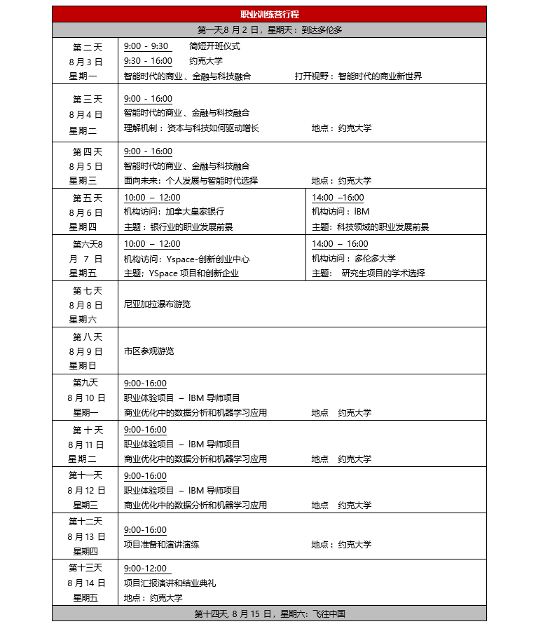 为培养面向未来的复合型领军人才,我校与加拿大约克大学携手 IBM(世界 500 强企业)联合推出暑期职业训练营项目。本项目为智能时代主题海外职业训练营项目,旨在通过多元模块培养学员的全球视野与实践能力。