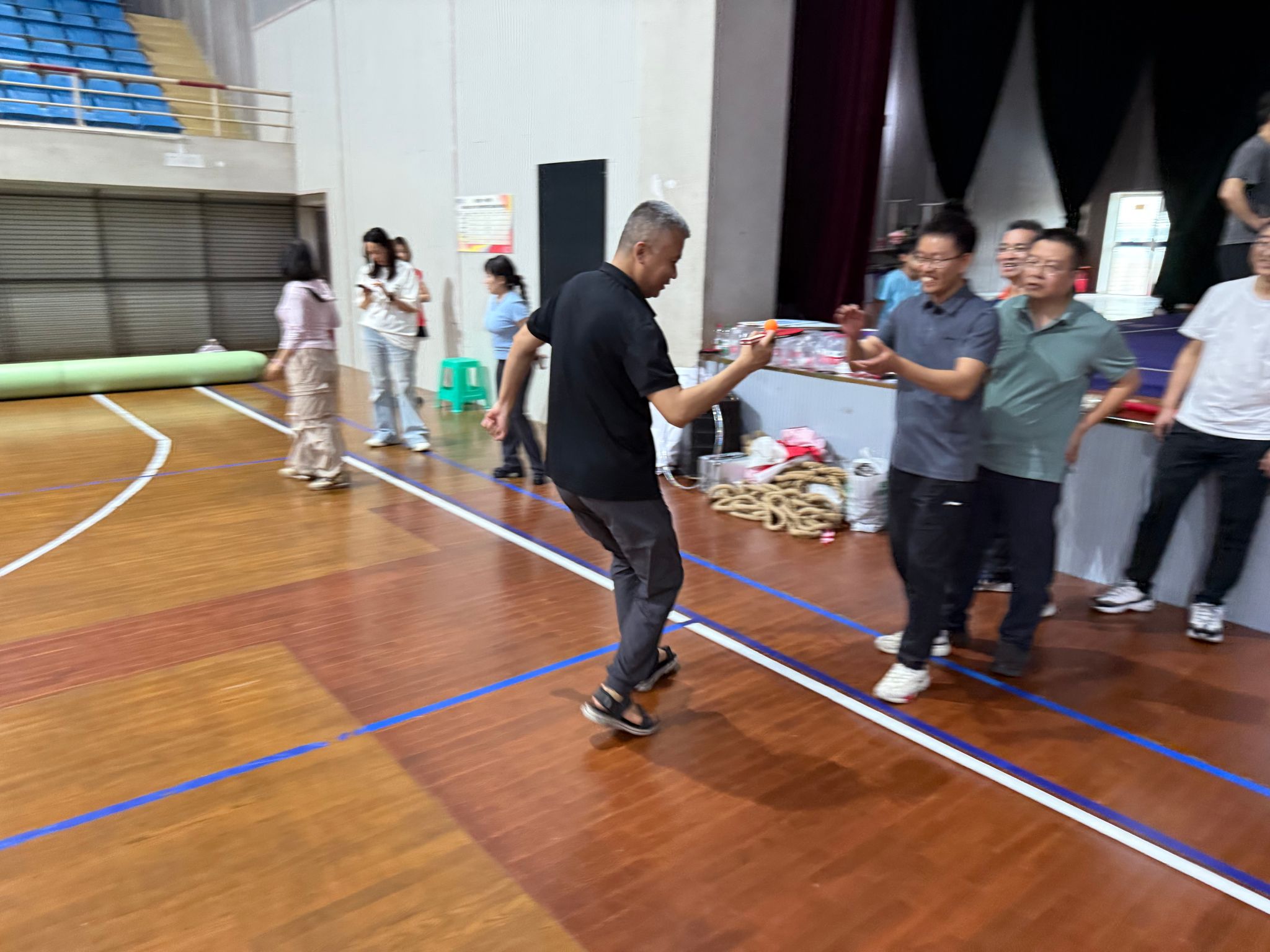 运动会按照精心设计的赛程有序展开。首项“运球上篮”比赛中,参赛教师们运球稳健,投篮精准,展现了出色的运动协调能力。随后“乒乓球运球跑”项目,教师们,排成一路纵队站在篮球场三分线外,裁判发令“开始”,老师们用乒乓球拍托着乒乓球,在规定的跑道上快速奔跑,过程中乒乓球不能掉落,参赛队员小心翼翼又争分夺秒,场面紧张有趣。压轴登场的“袋鼠接力跳”将活动推向高潮,参赛老师排成一路纵队站在篮球场三分线外,第一名选手站在大布袋里,双手提着袋口向前跳,到达指定地点后返回,将布袋交给下一位队员,以完成时间长短决定胜负,加油呐喊声此起彼伏,充分展现了顽强拼搏的体育精神。 活动最后按照三项比赛用时长短,评出王瑞临等16位老师获得一等奖;何华等16位老师获得二等奖;许颖等32位老师获得三等奖。
