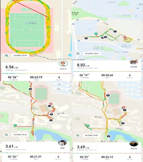 本次活动主要采用3-5人团队制开展,鼓励学子自行组队并定制融入红岩元素的队名,“红岩先锋队”“逐光红岩团”等队名彰显青春朝气与红色信仰,生动诠释“红岩儿女一条心”的团结内核。活动依托南北校区、兰花湖片区设置特色打卡点,赋予信念、团结、坚韧、忠勇、开放、争先六大精神内涵,同步设置单人1.6公里基础打卡、团队总里程4.8公里团队打卡双重规则,学子每日完成跑量后,需结合打卡点精神关键词撰写感悟,在奔跑中深化思想体悟。